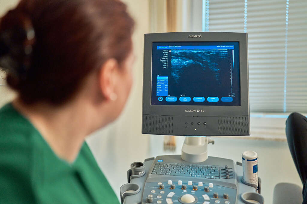 Sonographie ist die medizinische Bezeichnung für eine Untersuchung mit Ultraschall. Mit dieser Methode lässt sich beispielsweise während der Schwangerschaft das Kind in der Gebärmutter darstellen. Darüber hinaus wird Sonographie sowohl für die Diagnose als auch für die Verlaufskontrolle einer Erkrankung eingesetzt. Der Vorteil: das Verfahren ist risiko- und schmerzfrei, einfach, schnell anwendbar und das Ergebnis in der Regel sehr aussagekräftig.